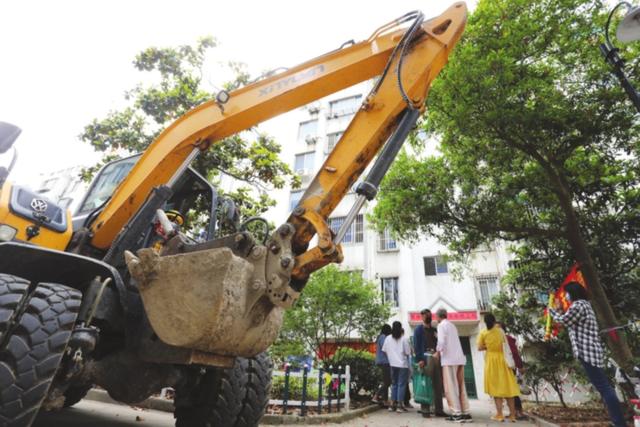 施工人員正在樓道單元門口挖開(kāi)路面,樓內(nèi)的居民用手機(jī)拍下這一激動(dòng)人心的時(shí)刻。記者杭興微攝 老小區(qū)增設(shè)電梯一直是備受關(guān)注的話題,尤其是去年粵海廣場(chǎng)三個(gè)單元樓成功增設(shè)電梯,讓老小區(qū)的居民們看到了希望。昨天,