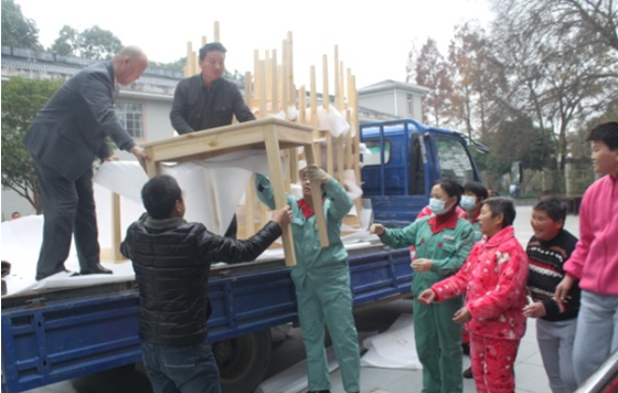 “來了,來了……”12月14日當公司的捐送物資剛開進福利院食堂大樓的門口,就已經圍了很多孩子,這是公司在了解到福利院現有的桌椅已經使用多年,有的搖晃不穩,有的擋板缺失,有的凹凸不平,公司高度重視,作出