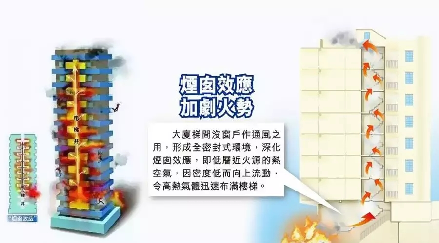 當建筑物內發生火災時,煙囪效應會將濃煙或火苗抽入井道內,造成火災危情的擴散。