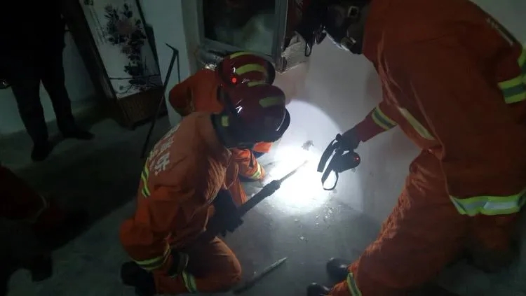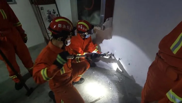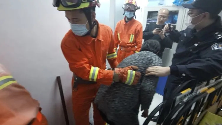 3、消防救援人員經過30多分鐘的緊急破拆出營救出口,次日凌晨1時許將7名被困人員依次救出,并移交120。