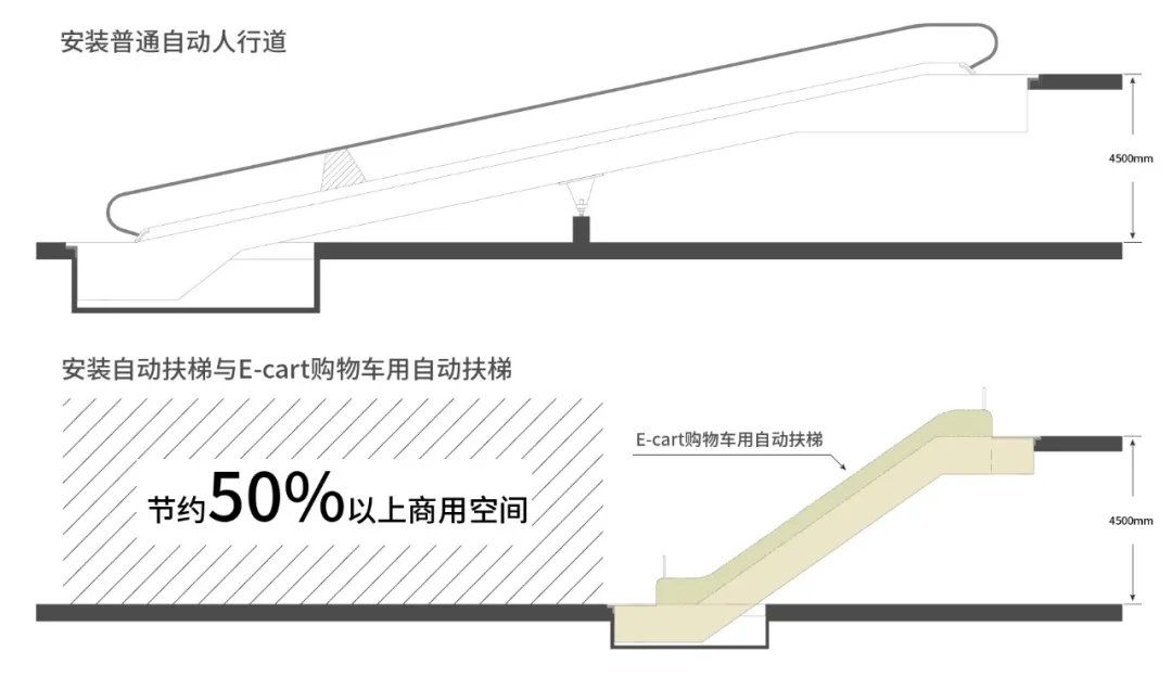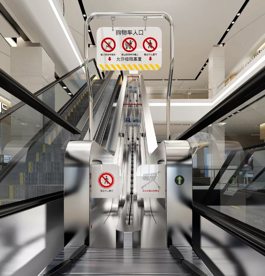 E-cart購物車用自動扶梯為購物車專用通道,有效防止并消除顧客手推購物車上自動扶梯所存在的較大安全隱患。該扶梯與常規自動扶梯角度同步運行(30°、35°),與常規扶梯并行安裝并配合使用。使得顧客與購物車分別同步使用上下專用扶梯通道,讓顧客購物體驗更加的安全舒適、輕松便捷。